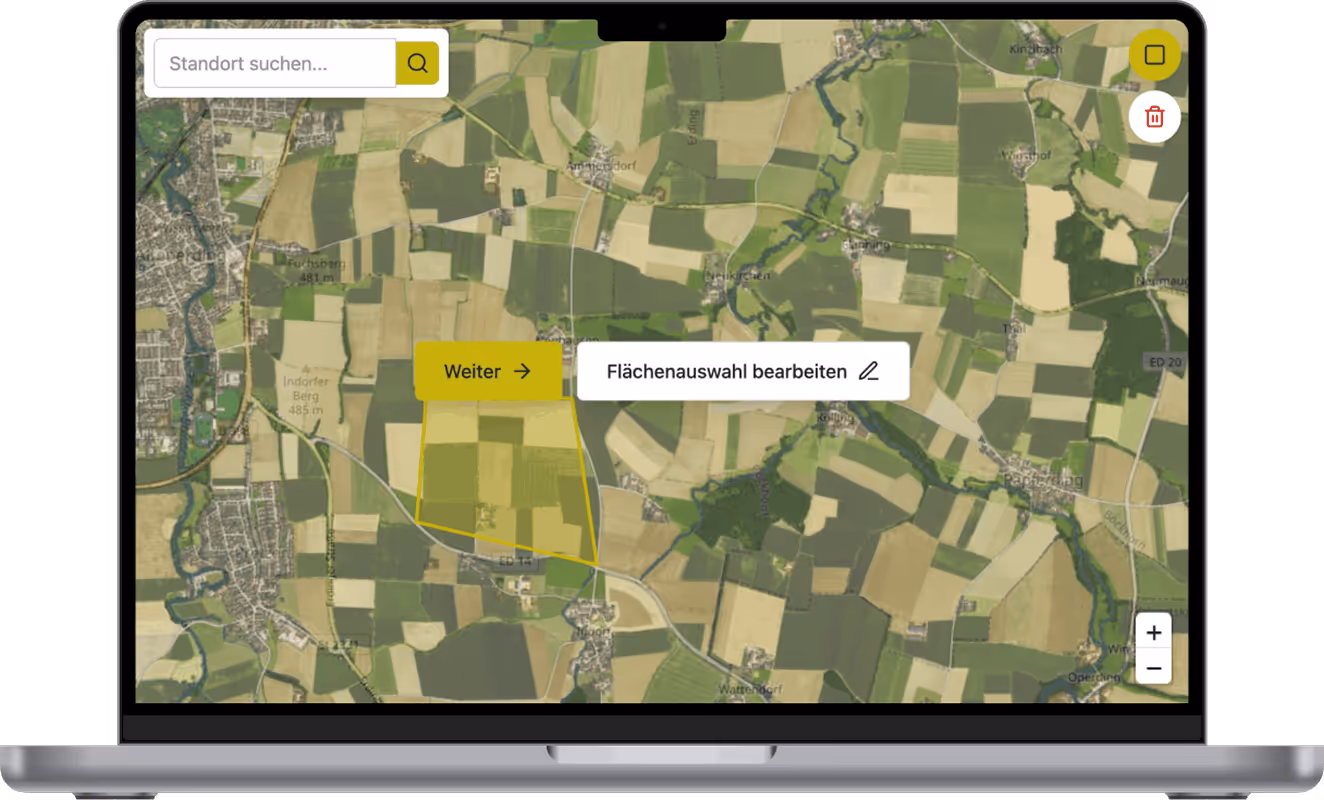 Reichen Sie jetzt Ihre Fläche in unserem Flächenauswahl-Tool ein – wir prüfen kostenlos und unverbindlich die Eignung für Agri-PV inkl. Machbarkeit, Wirtschaftlichkeit und Netzanschluss.