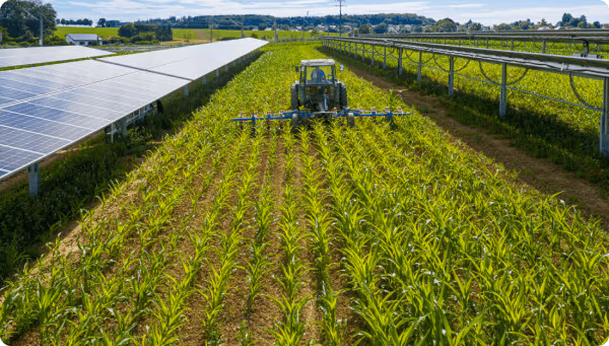 Große Reihenabstände, gleichmäßige Lichtverteilung und hohe Durchfahrtshöhen ermöglichen den Einsatz gängiger Landmaschinen. Zudem sind die Tracking Systeme für viele Kulturarten geeignet, wie bspw. Triticale, Soja, Ackergras, Luzernen, Zuckerrüben und viele weitere.